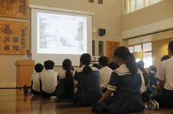 | 熊本学園大付属中学校で5回目となる出前平和講座「戦後80年 熊本大江の戦争を知ろう!~地域に残された歩兵十三聯隊の戦争遺跡を通して空襲、ヒロシマを考える深学科プログラム事前学習~」が、9月19日に開催しました。座学による地域の戦争学び、生徒発表のほか、歩兵第十三聯隊正門のほか、当時食堂・酒保所として使用されていた現学園大学第二体育館や熊本市田崎町から移築された「旧九州紡績・旧日華護謨株式会社熊本工場」の見学も行いました。当日の様子は9/21熊日「戦争遺跡に触れ 身近に」として紹介されました。 | ||