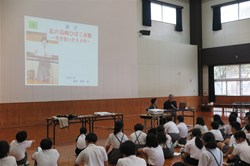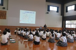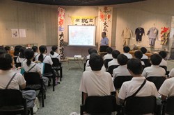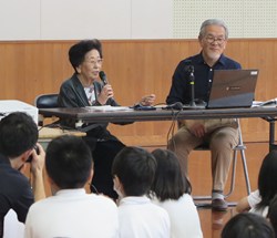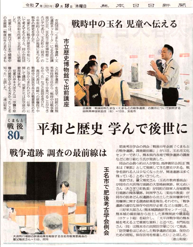 | 毎年10月期、修学旅行前の事前学習として出前平和講座を行っていた玉名町小学校では、今期は学習内容深化のため二回実施しました。9月は、玉名歴史博物館こころピアで開催中の「戦後80年 たまな・くまもとの戦争遺産」展及び常設展の見学を9月12日に行いました。その様子は、熊日新聞9/18「平和と歴史 学んで後世に 戦時中の玉名 児童に伝える」として紹介されました。また、10月3日には浦田藤枝さんの被爆体験証言と紙芝居上演、森高清さんから戦争体験の証言をお聞きしました。当日の様子は、熊日新聞10/13「被爆、疎開…体験語る」として紹介されました。 | |